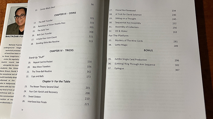 Baltazar Fuentes is an underground magician whose technical prowess at sleight of hand has been well known to those magicians in the inner circle. He regularly partook in Marlo's round table sessions alongside his more eminent students like Simon Aaronson, Steve Draun, David Solomon and the occasional out of towner who would inevitably drop in. When he performed at the fame Magic Castle in Hollywood, he also had sessions with Dai Vernon who was very fond of him and admired his technical skill. Larry Jennings also commented that "his construction of magical effects were absolutely marvelous".
