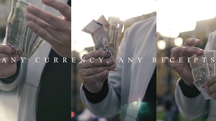 1 special gimmick made of a duty-free receipt and four realistic-looking $100 bills.