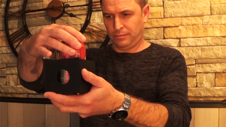 A can of Coke is placed into a box, Coke can be seen through the holes in the box the entire time. A blade is inserted through the box and the can. Top half of the box is now slid to the side slicing the can into two. Box is now pushed back, blade removed and can taken out of the box. Coke can now be opened and contents poured out to show its a real can of Coke.