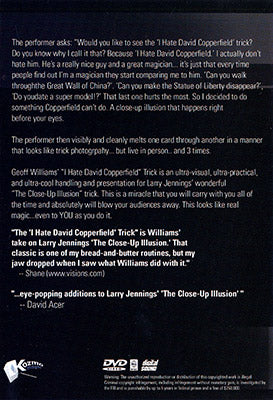 Geoff Williams' I Hate David Copperfield Trick is an ultra-visual, ultra-practical, and ultra-cool handling and presentation for Larry Jennings' wonderful "The Close-Up Illusion" trick. This is a miracle that you will carry with you all of the time and absolutely will blow your audiences away. This looks like real magic...even to YOU as you do it.