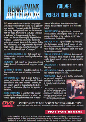 If it's been a while since you've watched a magician perform and have sat there totally clueless, you've apparently never seen Henry Evans work. And in this, his first ever video outing, Henry generously parts with the secrets that made him a Gold Medal winner at FISM 2000. First, you'll be slack jawed at the amazing magic that Henry creates...and then you'll be thoroughly delighted by how it's all done-diabolical cleverness rather than knuckle-busting sleight-of-hand. It's out-of-the-box magical thinking that's relatively easy to do but guaranteed to mystify and delight even the most jaded magical audiences. Henry will make you fall in love with magic all over again!