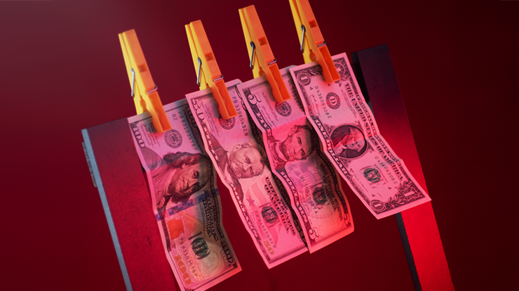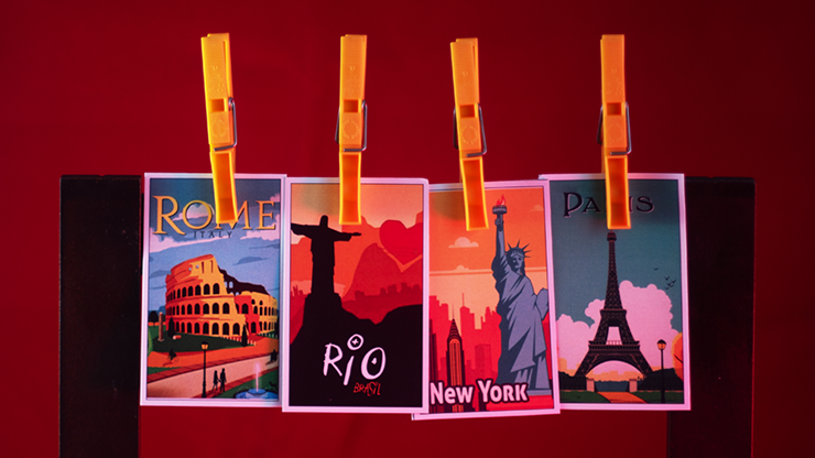 The magician shows a frame with 4 different colored socks hanging on it with clothespins. He shows the pairs of those 4 socks and places them in a paper bag. A spectator chooses one sock at random without the magician seeing it.