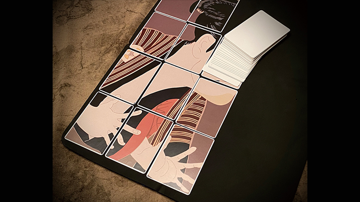 The magician asks a spectator select a card. Then he shows a deck of blank cards except for a couple of drawn cards. He places these two cards on the table and brushes the white deck across the table four times as if he were mainting, and each time releasing a "stripe" of cards. There will be four rows of cards on the table, vertically placed side by side, which will magically compose a drawing (they were white before!) representing a Japanese person who predicts the chosen card!
