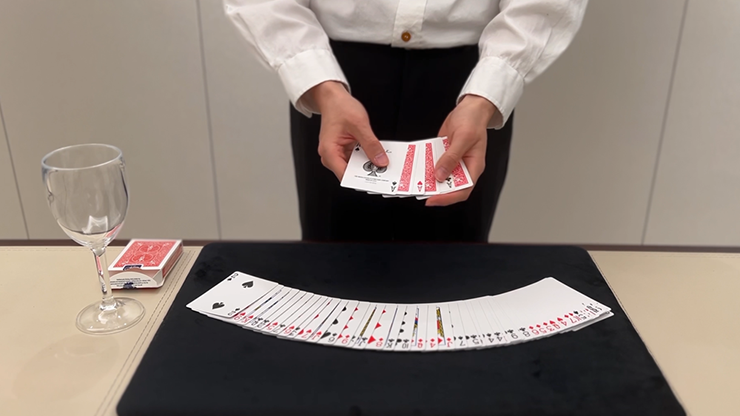 4 Aces are displayed on both sides and put inside a wine glass. 3 cards are chosen, vanish in the deck and reappear between the 4 Aces. The effect is just as described.