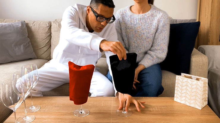Five different color velvet bags are shown placed opening end-down completely covering five drinking glasses. The audience is informed that one of the bags secretly contains a high denomination banknote. Despite the best efforts and completely free choice of up to four separate participants, the performer is left with the one bag and glass containing the prize money from the very start.