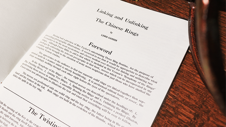 Three Chinese Rings by Lewis Ganson includes routines from Rex Taylor and Aldo Colombini, as well as Ganson's classic teachings. Some of the topics include: Three Ring Routine, Spinning the Rings, The Twisting Move, Triple Unlink, Two Rings and a Silk, plus much, much more!