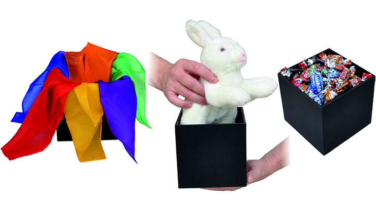 The magician shows the audience a giant die and an empty black box. He places it inside the box, snaps his fingers and pulls a rabbit out of the box. (Instead of the rabbit many other things can be made to appear, e.g. silks, candy, promotional items or gifts.)