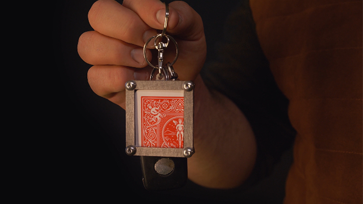 Imagine taking out your keys and show a beautiful metal keychain hanging on them. In it you can see through the back of a folded card. You put it in front of the spectators or in the hand of a spectator. Explain that this is your lucky charm.