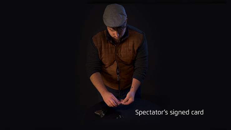 Then the spectator chooses a card and signs it. This card is put back into the deck and then the deck is shuffled. Perform your favorite ambitious card routines or impossible location card and to finish with a kicker ending effect, pay attention to the keychain in the spectator's hand since the beginning of the trick, take it off the screws and take the folded card inside it-here, unfold it, this is the spectator's card previously signed! an impossible because it was in sight imprisoned since the beginning of the trick even before the spectator chooses and signs his card.